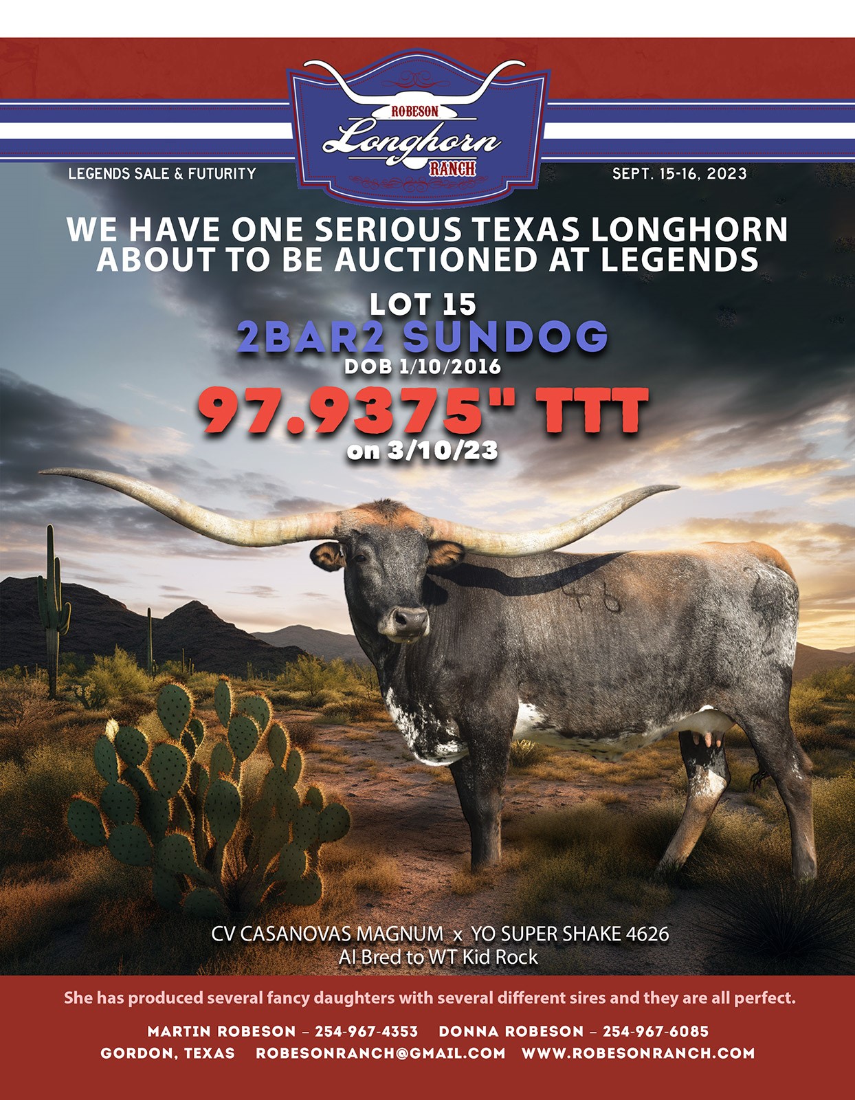 2BAR2 Sundog is the full package! We were excited to have purchased this cow out of the Legends sale in 2023. This cow has all the horn growth you could as for in one while keep a sound functional structure. Sundog has been wonderful producer giving us a bull calf out of WT Kid Rock in spring of 2024 and is confirmed bred to Justify for a spring 2025 calf.