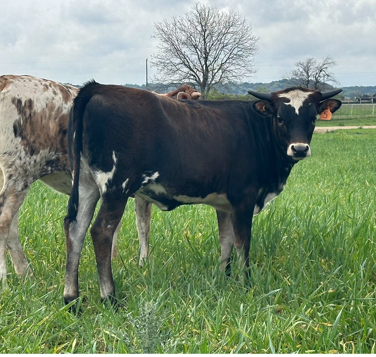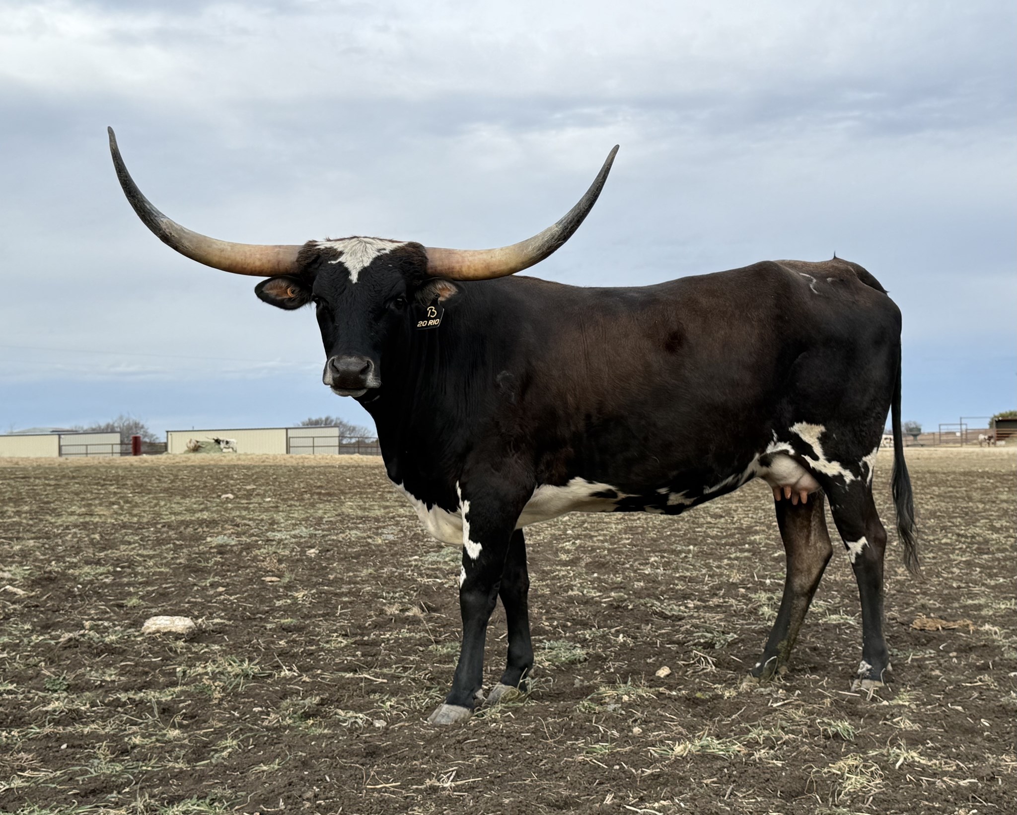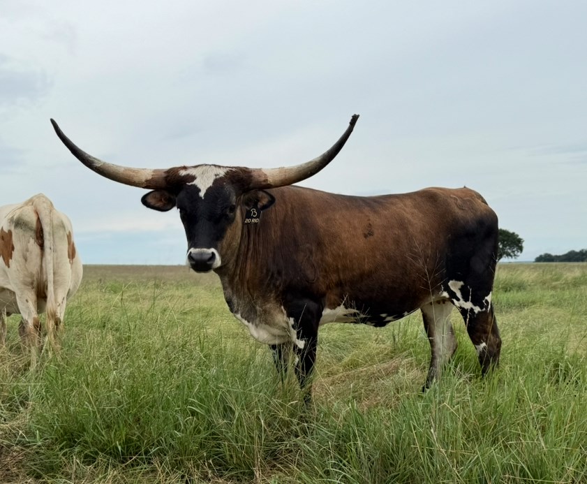 20 Rio is a beautiful young heifer out of Hubbells 20 Gauge and Hubbells Rio Trio, she carries a powerhouse pedigree packed with proven performance and predictability. Her bloodlines include Cowboy Catchit Chex, Horseshoe J Example, Concealed Weapon, and Sittin Bull — all foundational sires known for their horn length, structure, and strong maternal influence. You can already see her potential in her rich color pattern, deep body, and early horn direction that’s showing great promise. This heifer’s combination of 20 Gauge and Rio Trio breeding makes her the kind of female that will not only perform but also turn heads in any pasture.