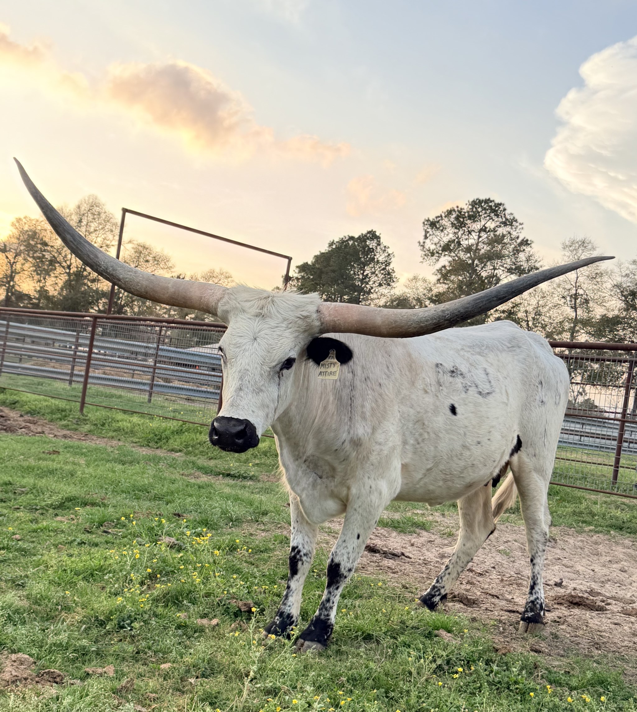 Beautiful black and white/Blue Roan female with an exceptional pedigree and huge set of horns. Double bred Tempter, daughter of Formal Attire to bring in the ICONIC over 100"TTT Horseshoe J Example, and Field of Pearls x 2. She is a great Momma and doing a great job raising her babies.